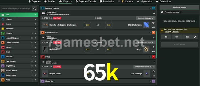 O 65k oferece uma grande seleção de opções de apostas em e-sports com probabilidades competitivas